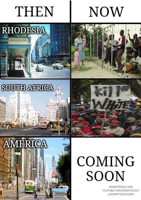 A white woman and her children are menaced by black men with an axe, holding signs that say “kill white.” The tweets Elon reposted called apartheid colonies “safe, clean…high civilization” while calling black natives to the “Dark Continent” the “primordial darkness of the Stone Age.” We’re called to resist the “race communism” and “anarchotyranny” of “Black rule and White erasure.”10 All of this is race war agitprop in direct defense of apartheid.11
