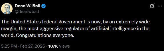 “As of Friday, every single investor in data center infrastructure suddenly lives in a world where the U.S. government feels that it would be acceptable, in one fell swoop, to significantly undermine the entire business model of a particular frontier lab. Congratulations, data centers have now become more expensive to build - for everyone (no, not just Anthropic). This also percolates to the business of every U.S. tech company generally (not limited to AI). Even those who dislike Anthropic need to understand that U.S. businesses, and investors in U.S. businesses, require a climate of business certainty. The U.S. government, by singling out a particular U.S. company in this fashion over a mere contractual disagreement, has *already* done great harm to the U.S. business environment.”
