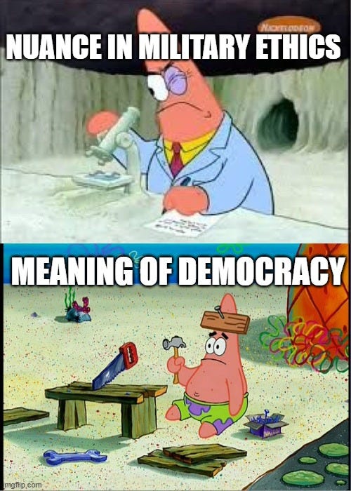 The grown-up belief in democracy is one where decisions like these are made through broad and ongoing popular input, bounded by constitutional guardrails. For example, whether our country goes to war with Iran should be determined by public debate between elected representatives on that specific issue, followed by a vote on that specific issue.